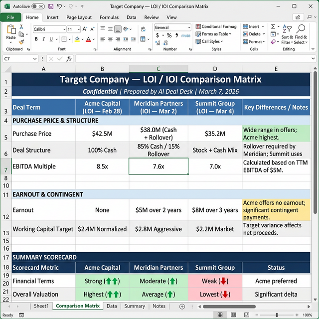 Pro users receive a professionally formatted Excel matrix with color-coded sections, a Summary Scorecard, and verbal deal summaries.